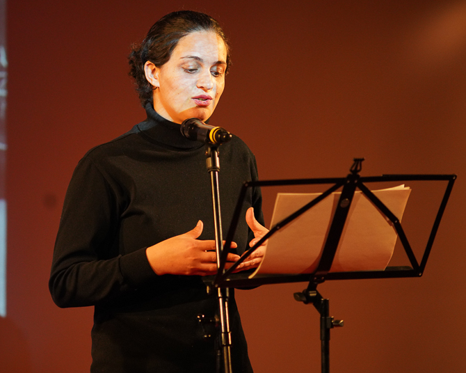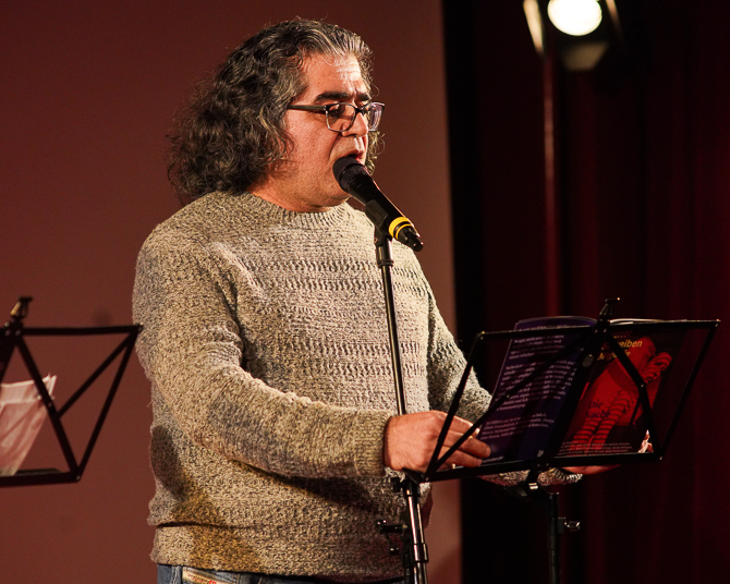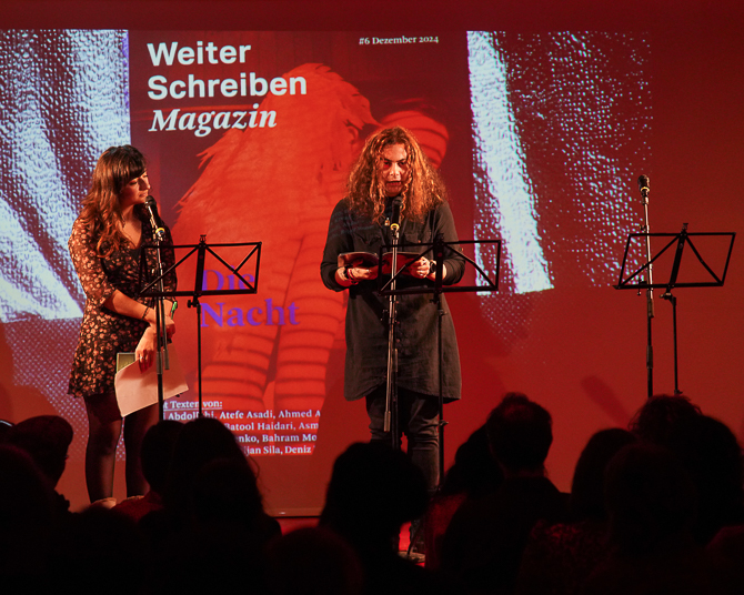 Zu den Lesenden des Abends gehörten bekannte und spannende Stimmen aus dem Projekt *Weiter Schreiben*. Daniela Dröscher, Kateryna Mishchenko, Abdul Wahid Rafee, Bahram Moradi, Sam Zamrik, Atefe Asadi, Mazda Mehrgan und Ali Abdollahi – um nur einige zu nennen – trugen ihre Werke vor und tauchten das Publikum in die vielschichtige Welt der Nachtliteratur. Ihre Texte, die von schlaflosen Nächten, flimmernden Gedanken und intensiven Emotionen erzählten, sorgten für eine tief berührende Atmosphäre.
